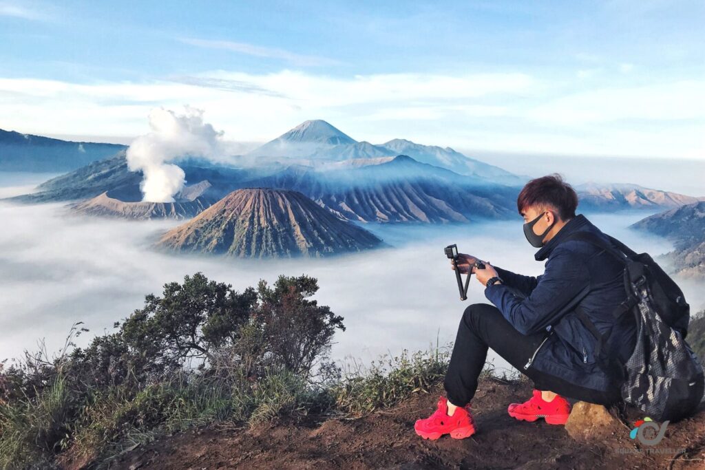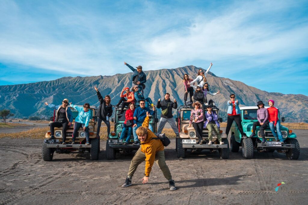 在布罗莫火山山脚下,以吉普车作为拍摄背景,搭配火山与沙海景观,拍摄充满冒险感的旅行照片。