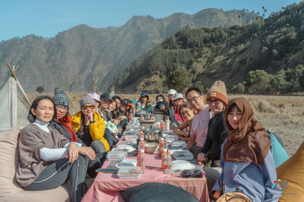 早晨结束登山后,在火山山脚下安排野餐时光,一边休息吃早餐,一边欣赏火山与辽阔沙海的景色。